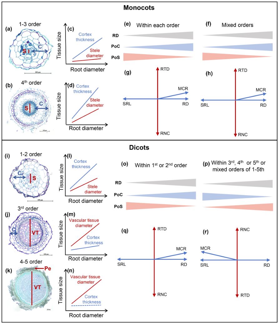 根系性状二维经济空间的提出,为理解植物资源获取策略及其对生态系统功能与过程的驱动作用提供了重要的理论框架。根系性状变异的二维性与根的解剖结构密切相关,尤其是皮层和中柱随直径的异速增长关系。近期研究表明,根系的解剖结构并非固定不变——皮层和中柱的比例会随根级显著变化。然而,目前多数相关研究往往忽视了这种解剖结构变化对根系性状经济空间的影响。