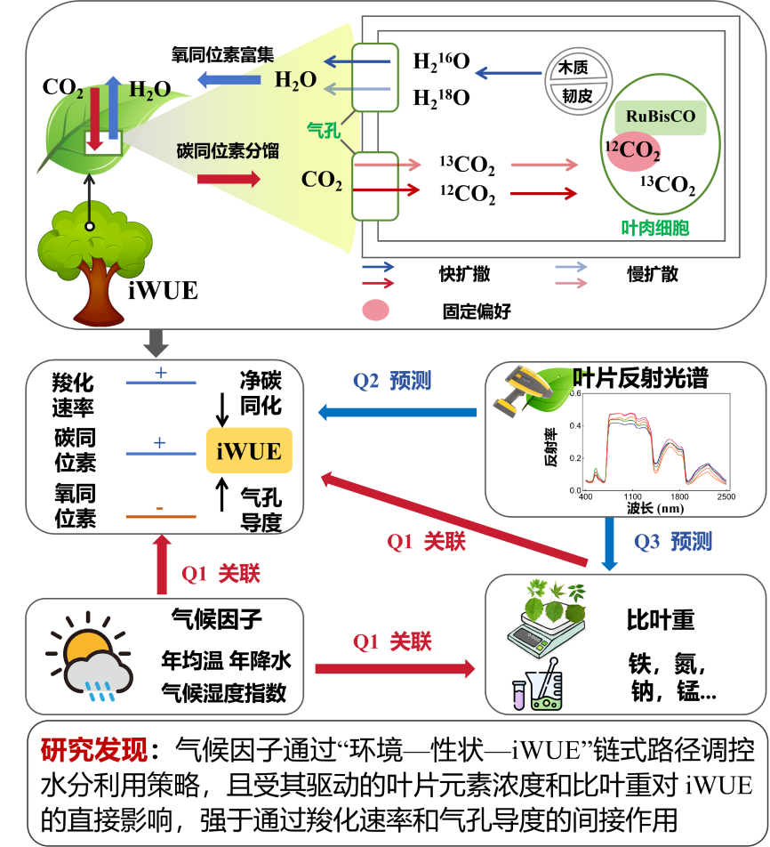 针对上述问题,中国科学院植物研究所植被结构与功能研究团队严正兵研究员等依托中国科学院林冠塔吊平台,系统采集我国三大典型森林生态系统的林冠叶片样本,进行了iWUE与多重叶性状、叶反射光谱的关联研究。结果表明,最大羧化速率,气孔导度,铁、氮、钠、锰浓度以及比叶重是驱动iWUE变异的关键性状。同时,气候因子通过“环境–性状–iWUE”链式路径调控水分利用策略,且受其驱动的叶片元素浓度和比叶重对iWUE的直接影响,强于通过羧化速率和气孔导度的间接作用。其次,叶片反射光谱技术在表征iWUE变异及性状与iWUE的关联方面,展现出较高的准确性。本研究不仅填补了“元素功能–水分利用策略”关联空白,还为生态模型提供了关键参数,提升了森林碳–水循环模拟精度。反射光谱技术的应用,也为未来通过遥感实现大范围、高时效监测奠定基础,对预测气候变化下森林功能动态、制定科学管理策略具有重要意义。