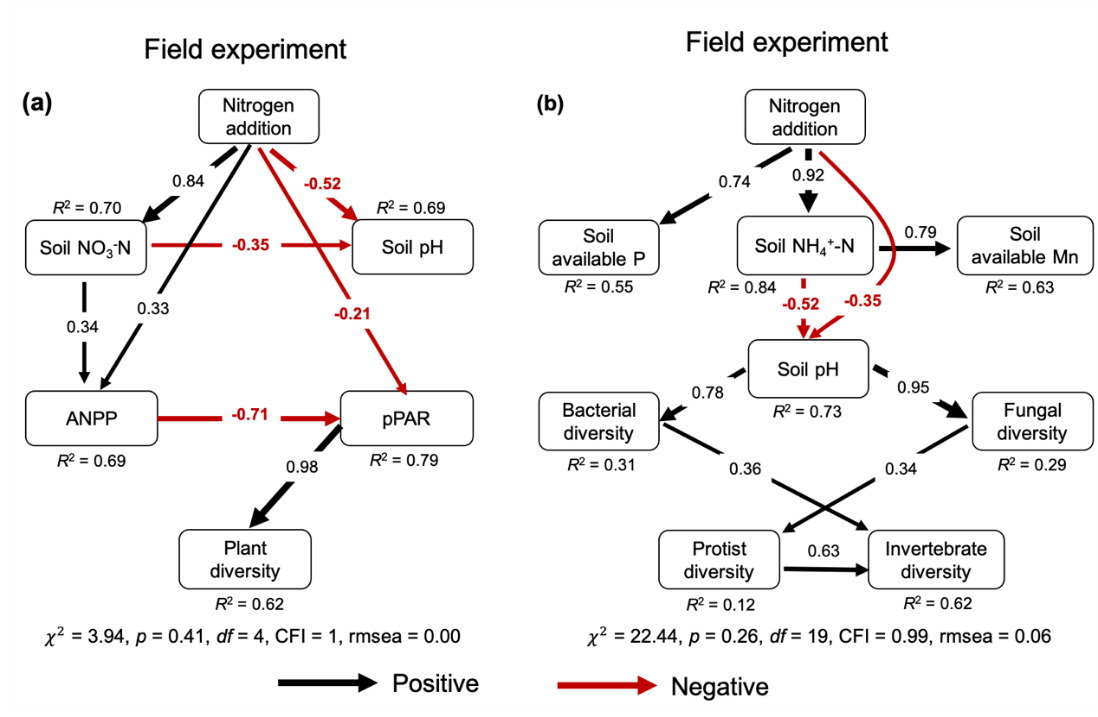 针对上述问题,中国科学院植物研究所潘庆民研究团队基于内蒙古呼伦贝尔草原长期氮添加控制实验,揭示了草原多营养级生物多样性和生态系统功能对氮富集的响应轨迹、阈值和机制。研究发现,尽管氮富集导致植物和土壤生物类群(土壤细菌、真菌、原生生物和无脊椎动物)的多样性下降,但其响应轨迹、阈值和驱动机制均存在差异。随着氮素添加量的增加,植物多样性表现为“先降低后趋平”的响应轨迹,而土壤各生物类群多样性均表现为“先不变后降低”;因此,植物多样性开始降低的氮素阈值显著低于土壤的4个生物类群。进一步的研究发现,养分富集导致的地上光竞争加剧是植物多样性降低的主要原因,而土壤酸化是导致土壤生物多样性降低的主要因素,且不同营养级生物类群之间存在明显的级联效应。从氮富集对生态系统多项功能的影响看,植物生产力和生态系统碳吸收表现为“先增加后趋平”,植物–微生物互惠关系表现为“先降低后趋平”,而有机质分解表现为“先趋平后增加”,其对应的氮素阈值以及驱动机制也不相同。研究人员进一步通过全球92个氮素添加实验的Meta分析验证了这些结果的普适性。上述结果有助于加深关于全球氮富集对草原生态系统影响及机制的理解,也为草原生态系统养分管理提供了依据。