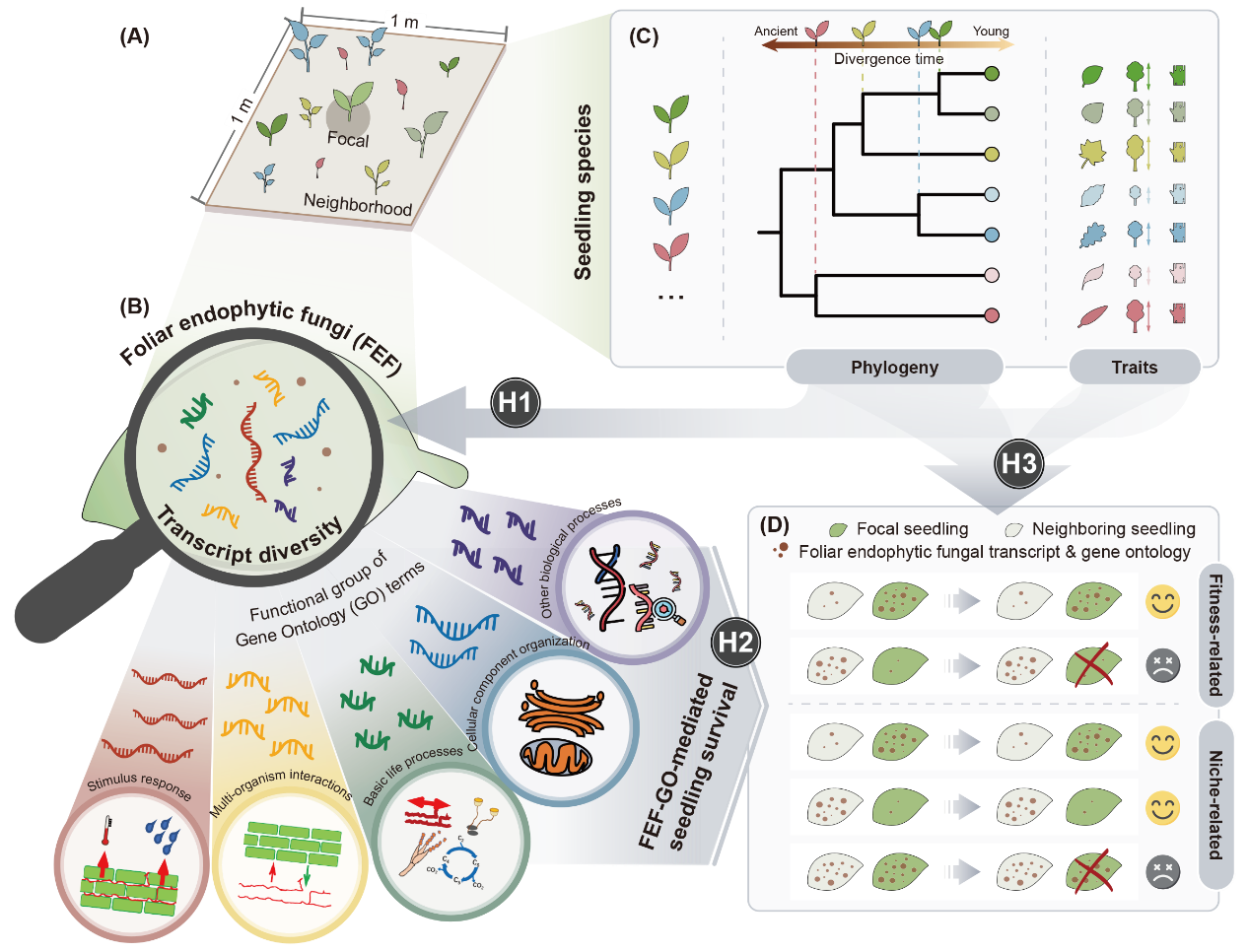 针对上述科学问题,中国科学院植物研究所生物多样性与生态安全研究团队整合了古田山亚热带森林103种木本植物幼苗的转录组数据、物种水平的功能性状以及长期幼苗动态监测数据,通过提取叶片内生真菌转录本并结合基因本体(Gene Ontology,GO)功能注释解析其分子功能,揭示了叶片内生真菌调控森林幼苗存活与物种共存的关键分子机制。研究发现,叶片内生真菌的转录本多样性与宿主植物的系统发育分化时间、最大树高密切相关,其分子功能可通过适合度差异和生态位分化两个途径显著促进幼苗存活;其中,高度依赖宿主系统发育的GO主要通过多生物互作相关的适合度差异过程发挥作用,而高度依赖宿主性状的GO则主要通过基础生命过程相关的生态位分化过程产生影响。