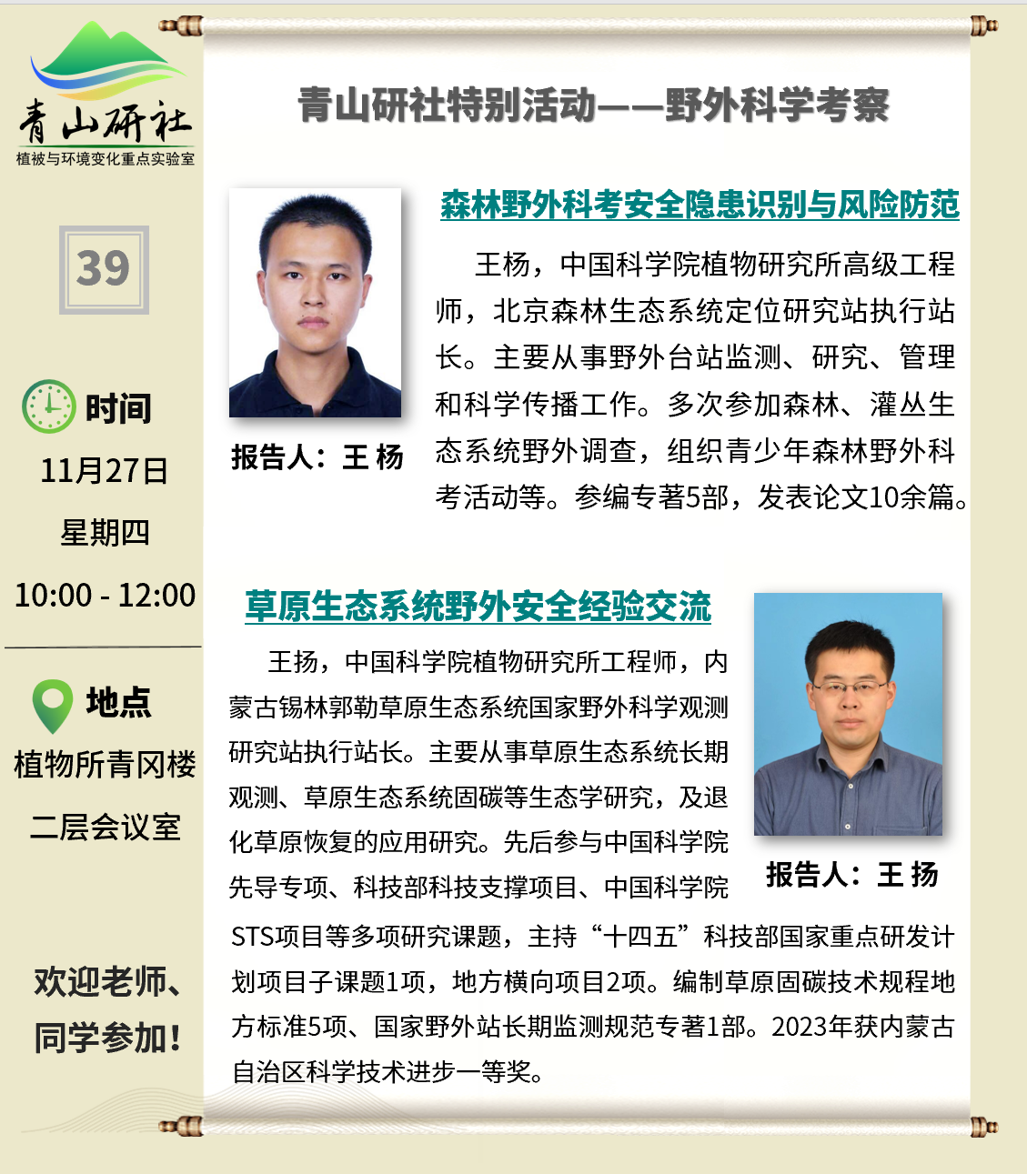 11月27日 青山研社 第39期(特别活动) 王杨、王扬:野外科学考察