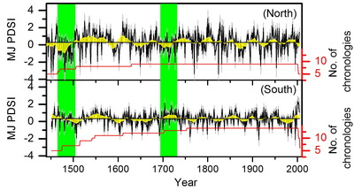 张齐兵研究组在过去10多年间,对青藏高原开展了多次野外考察,积累了大量第一手树木年轮样本,利用树木年轮学交叉定年技术建立了系统的树轮资料库。研究人员运用统计学和树木生长模型筛选出了对5-6月地表水分条件(以干旱指数PDSI来表示)敏感且同为刺柏属的23个树轮年表,发现北纬33度以北的9个树轮年表和以南的14个树轮年表分别具有相同的聚类特征;合成后的北部和南部区域树轮年表分别包含着较强的5-6月PDSI区域信号,依此重建了北部和南部5-6月PDSI在过去五个半世纪的变化历史;通过南北对比,发现了历史上两个显著的持续“南湿北旱”时段。