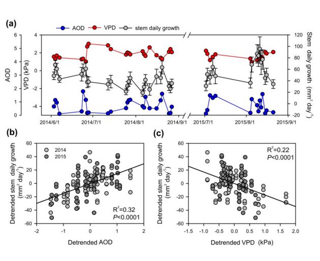不同气溶胶天气下杨树茎干生长的响应。(a)气溶胶光学厚度(AOD),饱和水汽压差(VPD)和杨树茎干生长速率的季节波动;(b,c)杨树茎干生长速率与AOD,VPD的关系。