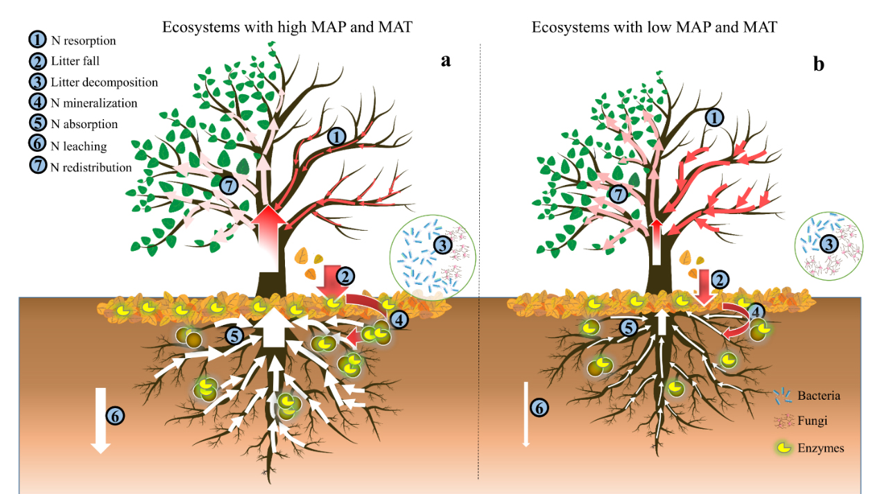 对大部分陆地生态系统来说,氮循环主要发生在局域性的、相对封闭的植物-土壤系统中。植物生长所需的氮约90%来自于叶片凋落前氮的再吸收和土壤微生物分解矿化有机氮这两个过程。因此,再吸收和矿化很大程度上决定了生态系统的氮利用效率和生产力。然而,由于再吸收是植物生理过程,而凋落物氮矿化速度主要受土壤微生物调控,以往研究基本都将它们视作相对独立的过程,二者之间的相互作用是如何调控生态系统氮获取和保留的机制尚不清楚。