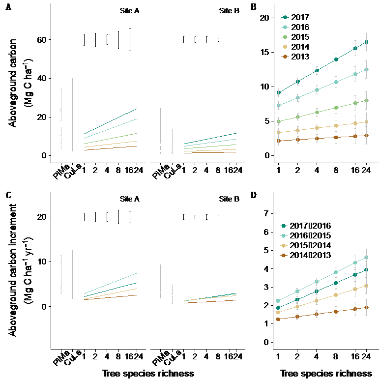地上样地植被碳储量(A、B)及每年固定的碳(C、D)随树木多样性的增加而增加