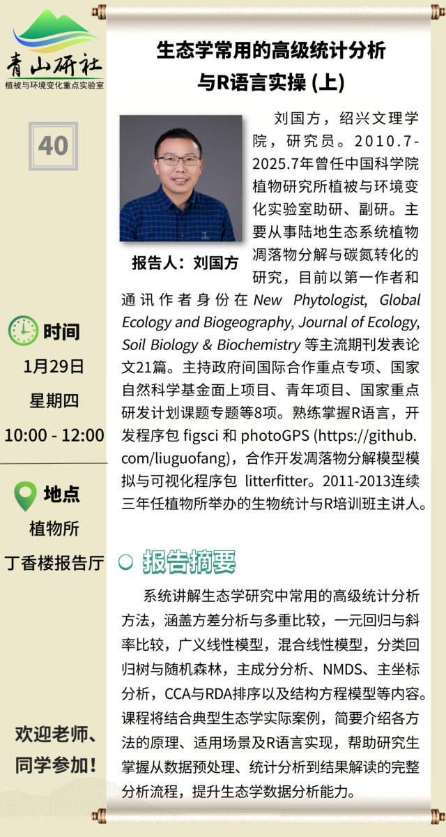 1月29日 青山研社 第40期 刘国方研究员:生态学常用的高级统计分析与R语言实操 (上)