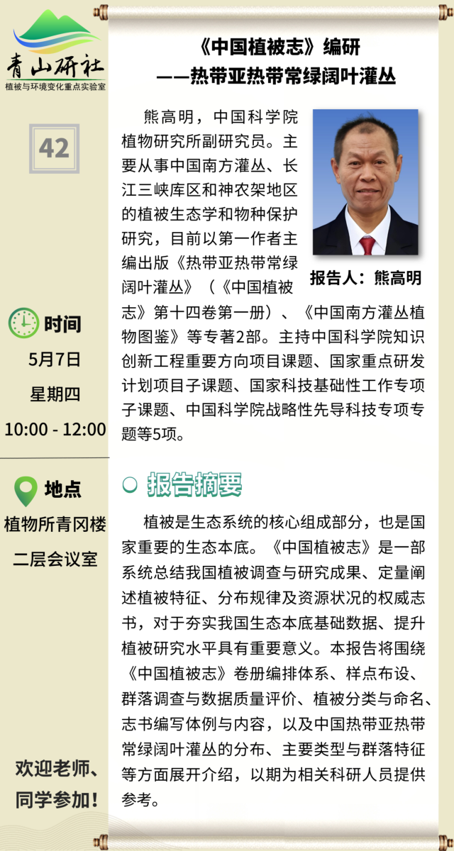 5月7日 青山研社 第42期 熊高明副研究员:《中国植被志》编研——热带亚热带常绿阔叶灌丛